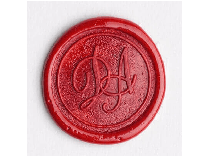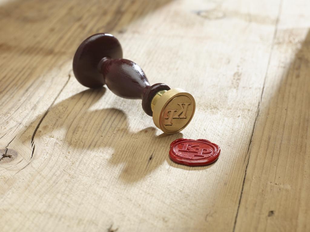 Lakstempel, 25 mm doorsnede, luxe mahonie houten houder met 2 sierlijke letters die schuin onder elkaar staan. Levertijd 10 dagen, of in overleg. Te gebruiken met zowel originele als flexibele lak.