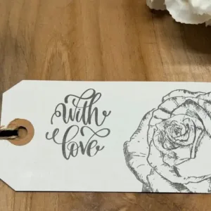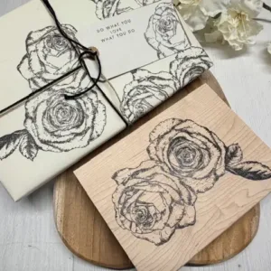 Stempel op hout uit onze eigen collectie. Formaat 165 x 130 mm. Prachtig gedetailleerd ontwerp. Op foto te zien hoe we er pakpapier mee gemaakt hebben maar ook op een klein aanhangkaartje slechts een gedeelte van de stempel gebruiken.