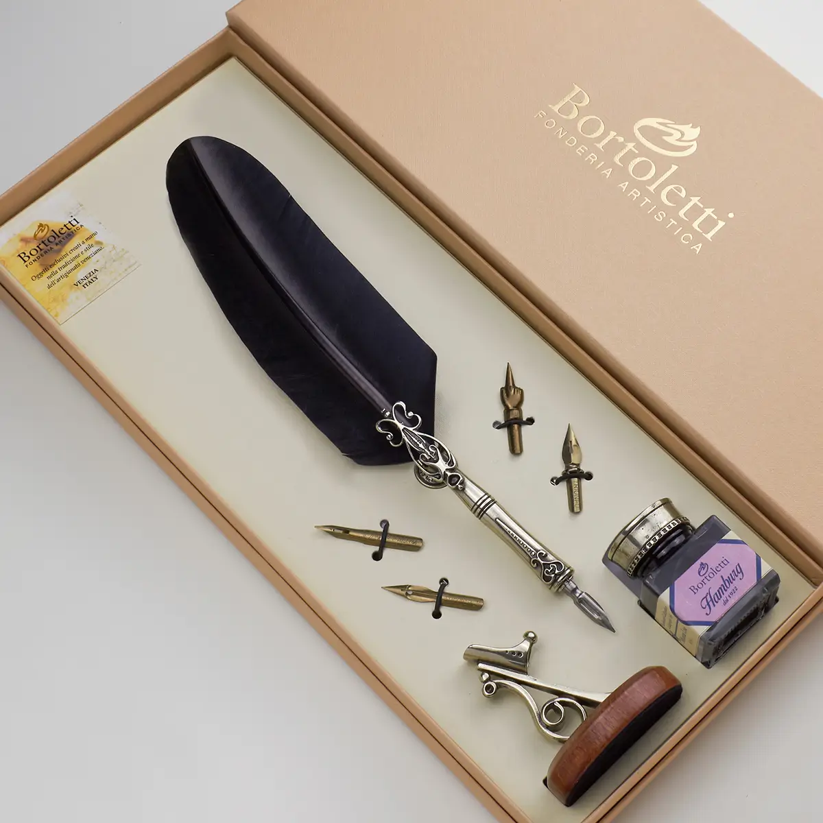 Elegante handgemaakte schrijfset uit Italië met een zwarte ganzenveer kroontjespen, bewerkt bronzen nibhouder en een grote fles zwarte inkt (30 ml). Inclusief 4 extra nibs en een mooie penhouder, verpakt in een luxe geschenkdoos.
