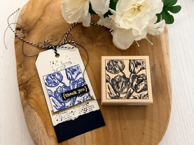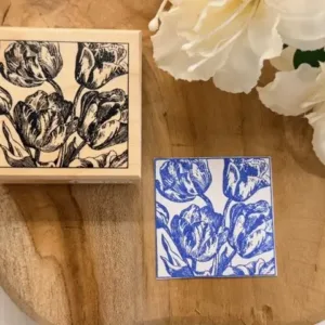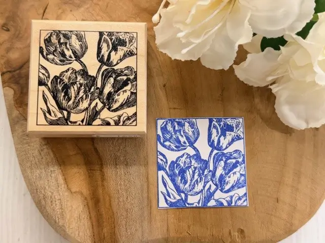 Magenta stempel victorian tulip square, stempel op hout, formaat 50×50 mm.