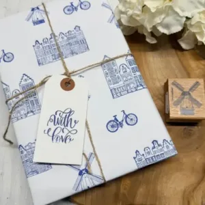 Cat’s on appletrees stempel op hout. Formaat 40 x 33 mm. Het inpakpapier hebben we gestempeld met versafine clair blue belle, een prachtige blauwe hollandse kleur.